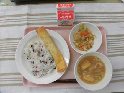 梅わかめごはん シシャモのパリパリ揚げ 生揚げのみそ汁 煮びたし 牛乳