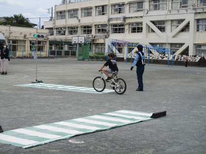 校庭で、自転車の乗り方や点検についてお話を聞き、13人の代表のお友だちが、モデルとなり、実際に自転車に乗って、横断歩道の渡り方、見えずらい角での横断のしかたを走ってもらい、大事なポイントを学習しました。
