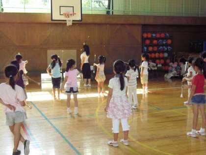 “バトントアリング”は前回と同じようにバトンの扱い方をていねいに教えていただきました。お姉さんたちのようにかっこよく踊れたらなあとみんな思いました。
