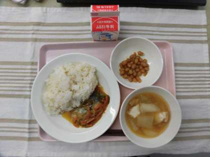 七分つき米ごはん 鰆の野菜あんかけ 冬瓜のみそ汁 ぶどう豆 牛乳