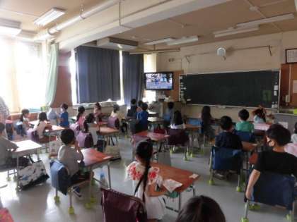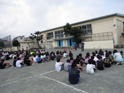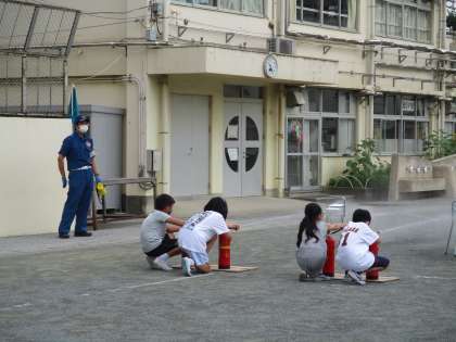 避難訓練がありました。火災発生のときの避難や初期消火の仕方を校庭と教室に分かれて学びました。