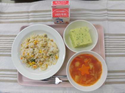 コーンピラフ ミネストローネ 小松菜ケーキ 牛乳