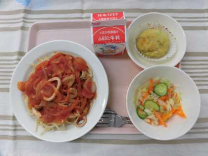 スパゲッティペスカトーレ フレンチサラダ お月見スイートポテト 牛乳