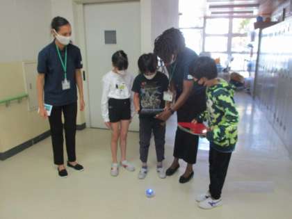 グループごとに、旅行や学校の場所、球形ロボットのプログラミングの英語表現活動を行いました。