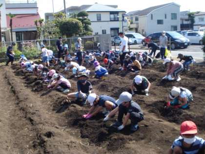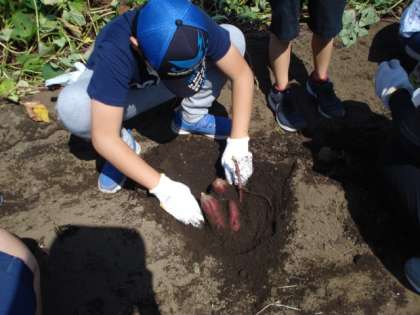 学校から歩いて5分ほどの畑に、さつまいもを掘りに行きました。つるを見つけたら、ひたすら掘ります。大きいお芋が出てくると、歓声が上がります。最後の片付けまで立派にできました。お芋料理が楽しみですね。