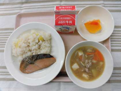 栗ごはん 鮭の照り焼き 豚汁 柿 牛乳