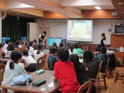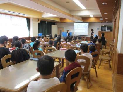 ゲストティーチャーが、クイズや実験をしながら飲み水ができるまでについて