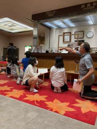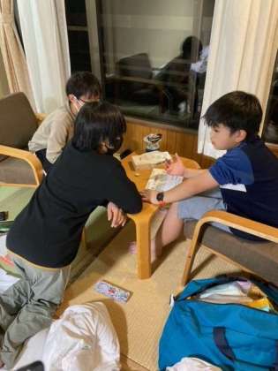 夜はレク係企画のクイズ大会です。?子供達はレク係の出す放送を聞いて、部屋ごとに考え、回答用紙に記入していました。