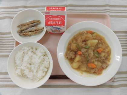 麦ごはん キビナゴのから揚げ 肉じゃが 牛乳