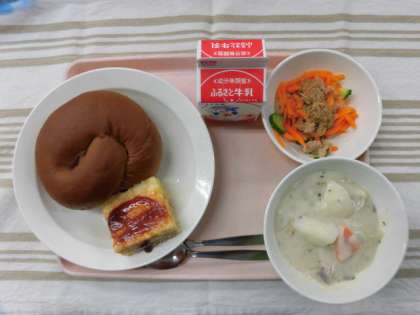 ココアパン ポテトオムレツ かぶときのこのホワイトシチュー にんじんのラペ 牛乳
