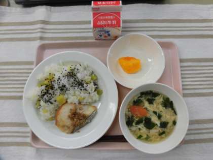 さつま芋ごはん 鰆の香味焼き かきたま汁 柿 牛乳