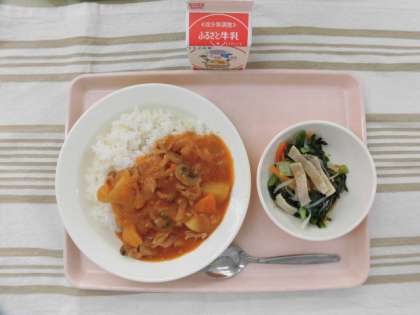 米粉のハヤシライス 小松菜とハムのサラダ 牛乳