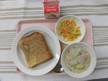 セサミトースト さつま芋のクリームシチュー もやしのカレー風味 牛乳