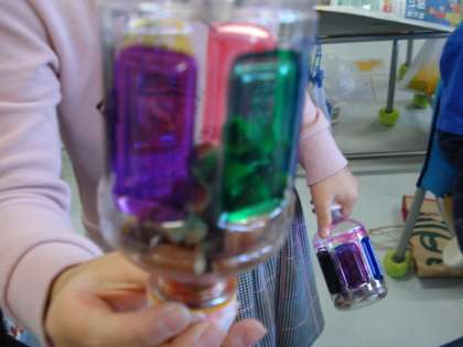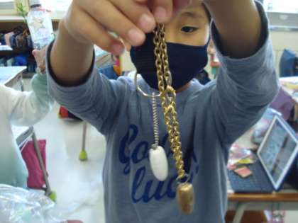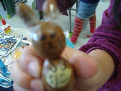 駒沢公園でひろってきたどんぐりを使って、作品作りをしました。動物、アクセサリー、楽器、やじろべー、こま等々、子どもたちは自由な発想で夢中になっていました。