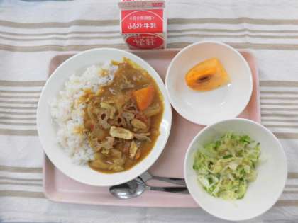 根菜カレーライス キャベツのサラダ 柿 牛乳