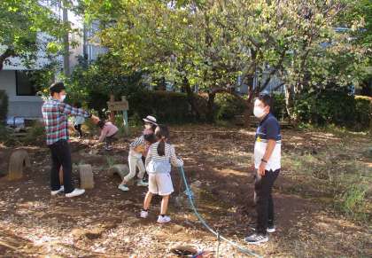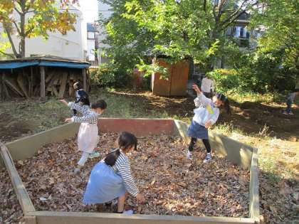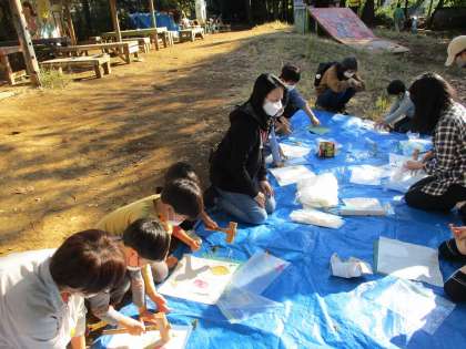 プレーパークでは、落ち葉で遊んだり、花びらや葉をたたいて色を染める「たたき染め」をしたりしました。