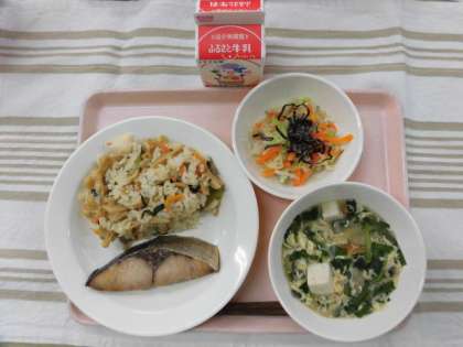かやくごはん ブリの照り焼き にらたま汁 昆布サラダ 牛乳