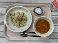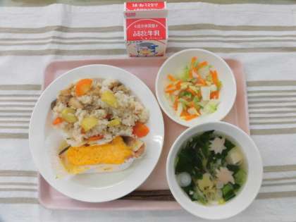 吹き寄せごはん 鮭の紅葉焼き すまし汁 白菜の甘酢和え 牛乳