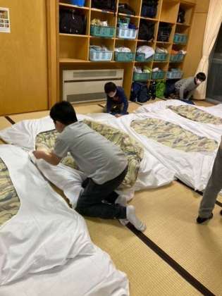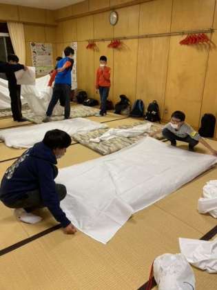 みんなで協力して布団を敷きます。