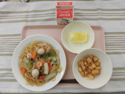 あんかけ焼きそば ビーンズポテト りんご 牛乳
