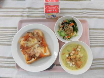 ピザトースト パンプキンシチュー わかめサラダ 牛乳