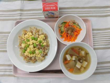 3色そぼろ丼 あったまるだし汁! にんじんのラペ 牛乳