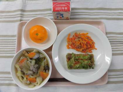 おっきりこみ風 竹輪の磯辺揚げ にんじんのじゃこ炒め みかん 牛乳