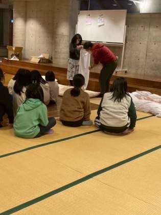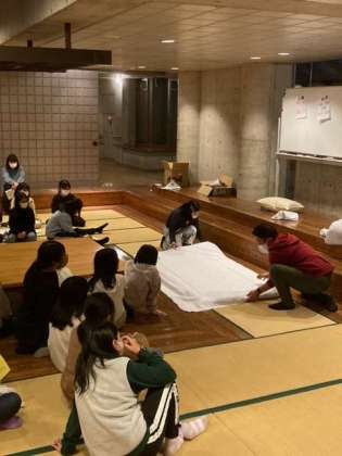 外が思ったよりも明るいので、キャンプファイヤーは夕食ごに変更しました。先に布団の敷き方やたたみ方を補助員の方に教えてもらいました。