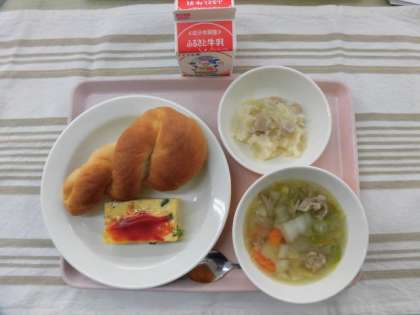 米粉パン カラフルオムレツ 白菜スープ ジャーマンポテト 牛乳