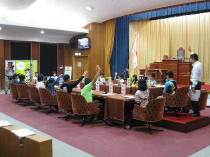国会参議院では、傍聴席でゆっくりと説明を聞き、その後、「参議院の委員会・本会議での法案審議」を模擬体験しました。