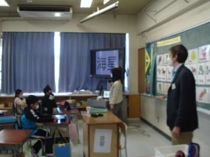 小学校の外国語活動では、言語そのものを覚えることも大切ですが、英語を通して知的好奇心をくすぐるような授業の実践が子どもの学習意欲を高めるには必要です。3年生の学習では、生き物を漢字で表記し、なんという生き物を表しているか考える授業をしていました。ただ単に生き物の名前を英語で繰り返し覚えるだけでなく、こんな工夫も楽しいですね。「海星」と書いて、英語で何というでしょう?いろんな意見が出て、楽しかったです。