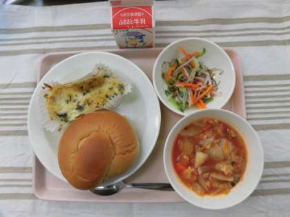 黒砂糖パン タラのパン粉焼き ミネストローネ もやしのサラダ 牛乳