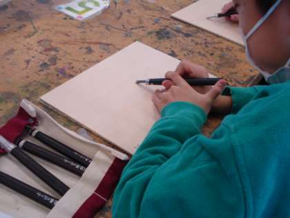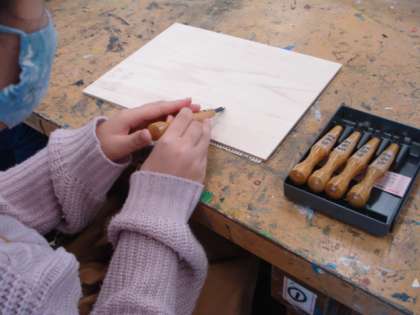 彫刻刀の使い方を学習しました。刃の前に手を置かないことなど、いくつかの約束事を守って、真剣に掘る練習をしていました。これができるようになると木版画に挑戦です。