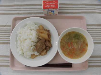 ごはん 豚肉とこんにゃくの煮物 ピリ辛中華スープ 牛乳