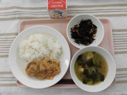 ごはん ホキのおろしソース みそ汁 ひじきの炒め煮 牛乳
