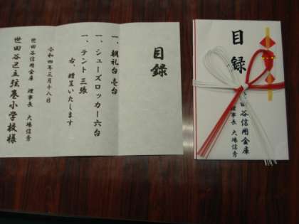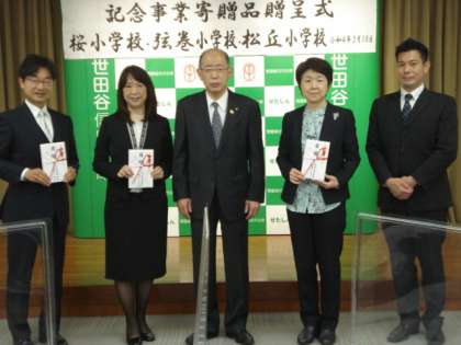 世田谷信用金庫様が100周年の記念に、地域貢献の一つとして、近隣の学校(桜小・松丘小・弦巻小)に寄贈品をというお話があり、今日、その贈呈式に行ってまいりました。