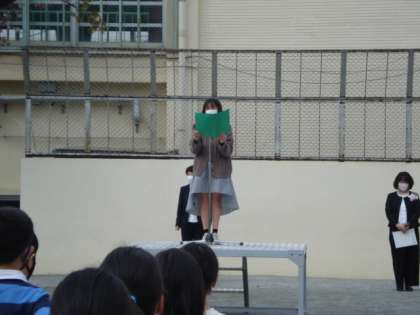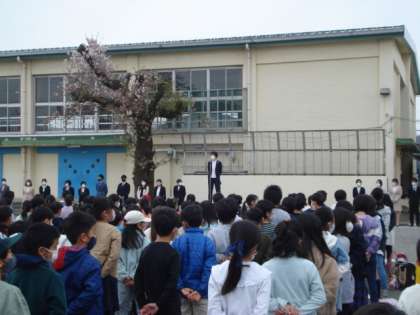 久しぶりに校庭に集合した子供たちは、話の聞き方がすばらしく、新年度に向けた意欲を感じました。1学期終わるころ、または1年後、どんな自分になっていたいか、それをイメージしながら生活していこうと話しました。