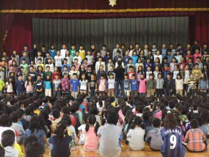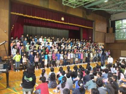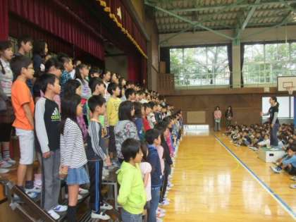 体育館に元気のよい歌声が響きました。4年生の歌声です。