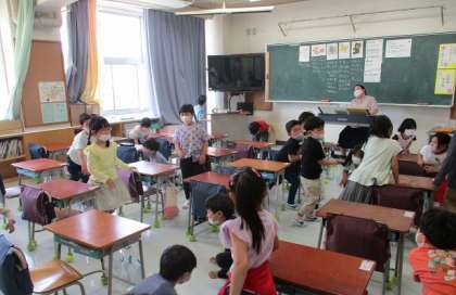 今週から1年生の音楽の学習が始まりました。初回は「おおきいおと ちいさいおと」「はやい おそい」という音楽で使う言葉と、「ひらひら ぴょんぴょん どっしどっし ちょこちょこ」などの言葉を学び、きこえてきた音楽に合わせて、絵カードの生き物になりきって楽しく動きました。また、弦巻小学校校歌も声を合わせて歌いました。