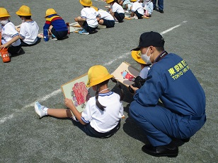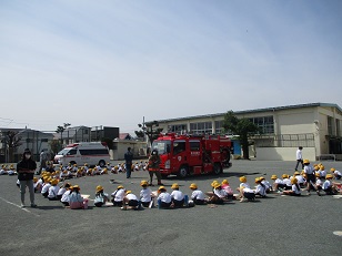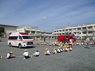 今日は弦巻小に消防署の方が来てくださり、1年生が消防車と救急車の写生会をしました。