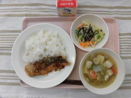 ごはん 鮭の変わりソースかけ けんちん汁 昆布サラダ 牛乳