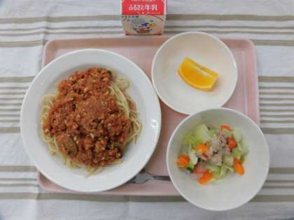 スパゲッティミートソース カラフルサラダ 甘夏みかん 牛乳