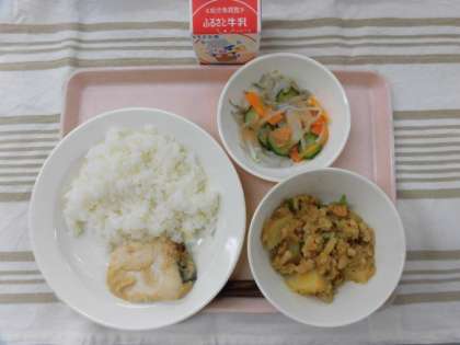 ごはん 鰆の西京焼き じゃが芋のそぼろ煮 こんにゃくサラダ 牛乳