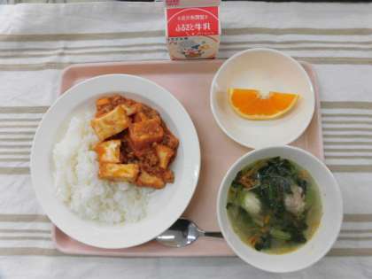 ごはん 生揚げの四川煮 春雨スープ 清見オレンジ 牛乳