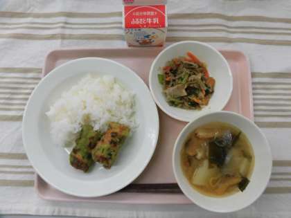 ごはん 竹輪のお茶の葉揚げ みそ汁 春ごぼうのきんぴら 牛乳