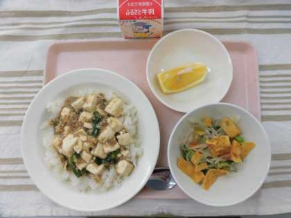 麻婆豆腐丼 パリパリサラダ ジューシーフルーツ 牛乳