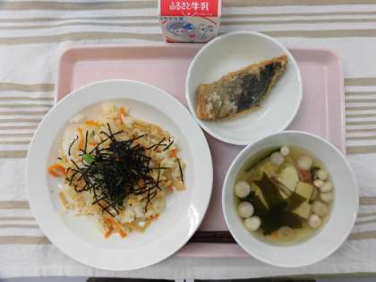 たけのこ寿司 鯵の竜田揚げ お麩のすまし汁 牛乳