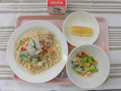 アスパラガスのホワイトソーススパゲッティ ビーンズサラダ 美生柑 牛乳