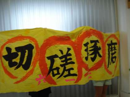 明日は晴れの予報です。今日の雨は、疲れが出ている子供たちにはよいかもしれません。6年生は、明日の演技で、クラスごとに作成した横断幕を掲げます。今日は、先に横断幕をお見せします。