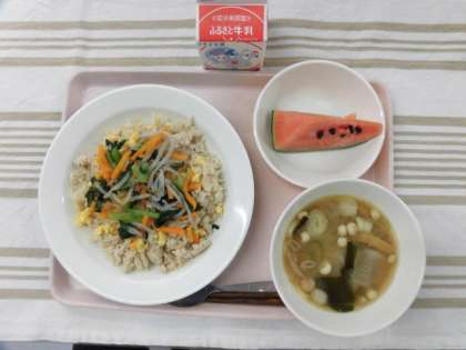 二色そぼろごはん お麩のみそ汁 小玉すいか 牛乳